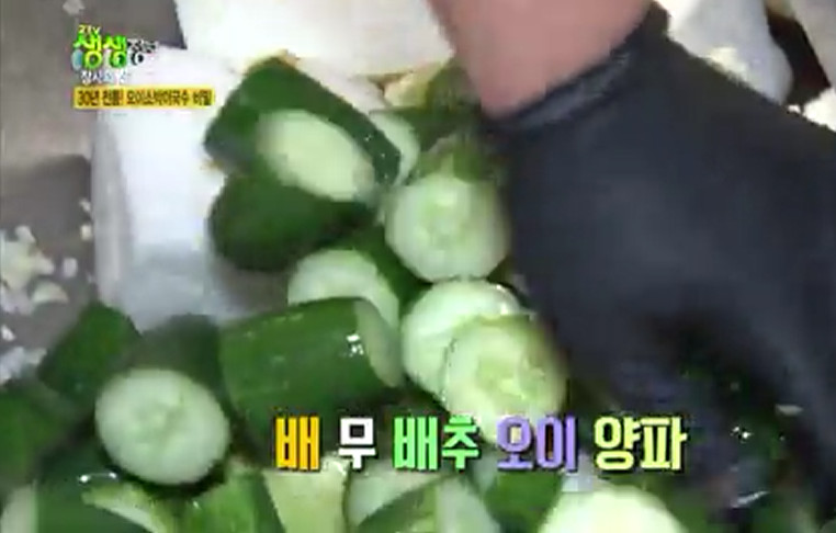 오이소박이 국수에 들어가는 오이소박이 만드는 방법은 오이 소박이 절이는 방법은 오이를 먹기 좋게 짤막하게 썰어서 끓는 소금물에 오이를 절이면 오이의 시각은 더 악해지고 색깔도 파래 진다네요. 물6에 소금 1 비율로 15분 재워두면 더 아삭 아삭 해지고 색깔이 더 파래진다고 합니다. 야채 육수는 온가족이 노력해서 만들었다고 하네요.
